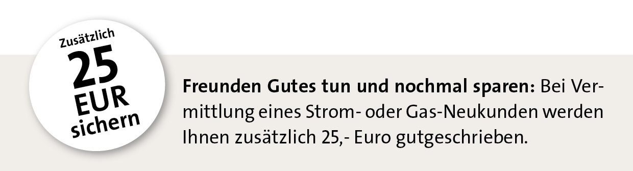 Für jede erfolgreiche Vermittlung an einen Ihrer Verwandten oder Freunde erhalten Sie im Rahmen unserer Kunden-werben-Kunden Aktion, sofern Sie selbst bei uns bereits Strom-, Wärmestrom und/oder Gaskunde sind, eine Prämie in Höhe von 25,- Euro.